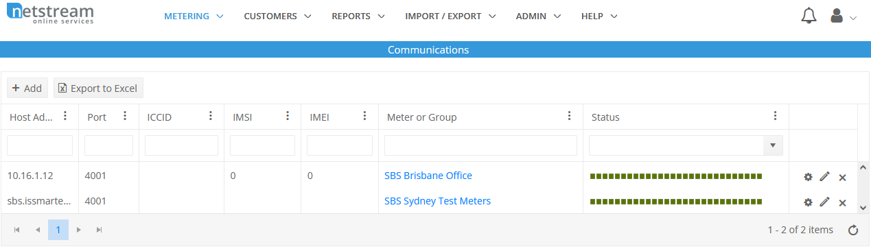 This screen is accessed off the Metering > Communications menu or from the context menu of a meter (cog > View Communications).