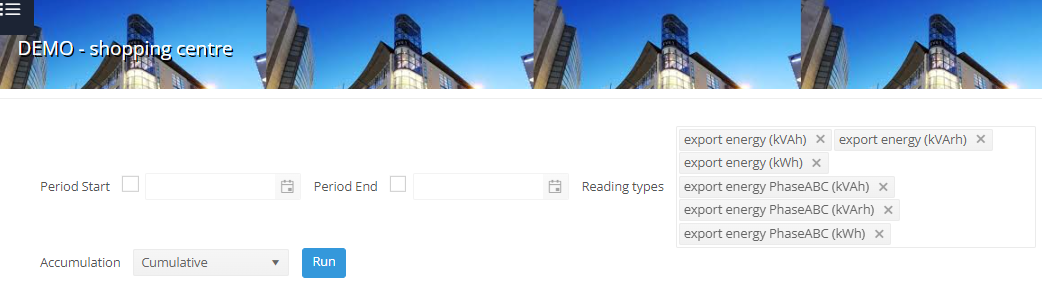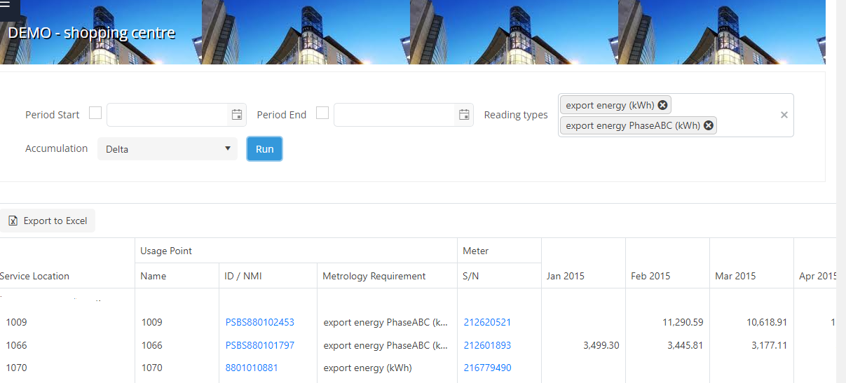 The Billing History Report provides monthly meter readings for each usage point in a Usage Point Group for a selected range of billing periods. This information can be used as input to the tenant billing process. By default, the billing period range is unspecified, meaning the report will display all billing periods stored in Netstream, however, this can be changed using the date selection boxes.